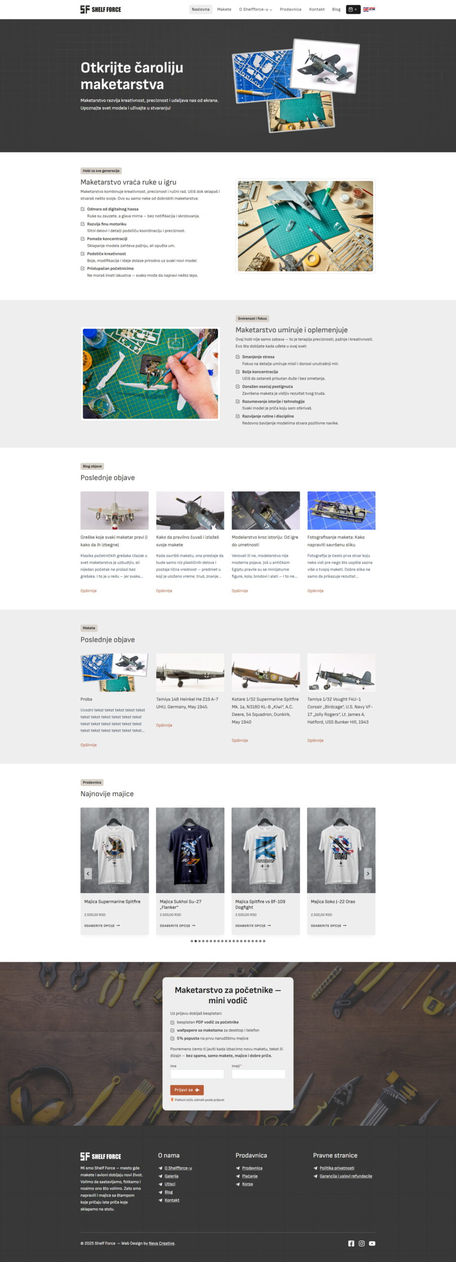 Shelf Force je mesto gde makete i avioni dobijaju novi život. Volimo da sastavljamo, fotkamo i nosimo ono što volimo. Zato smo napravili i majice sa štampom koje pričaju iste priče koje sklapamo na stolu.